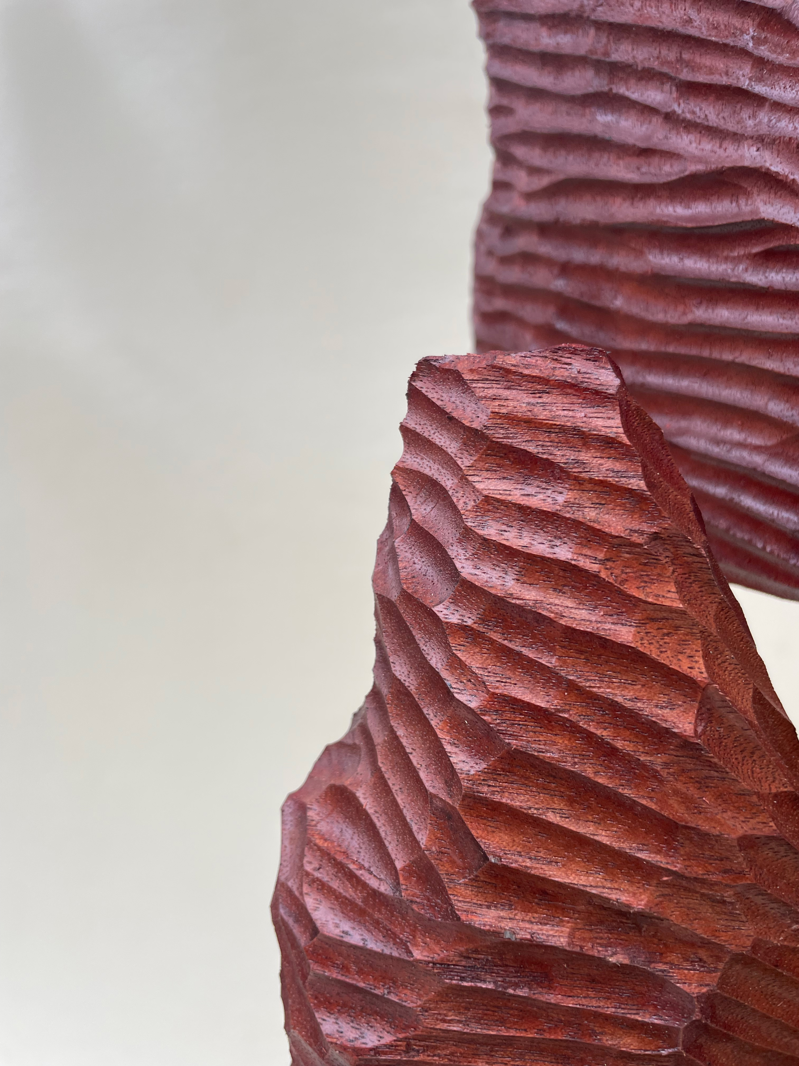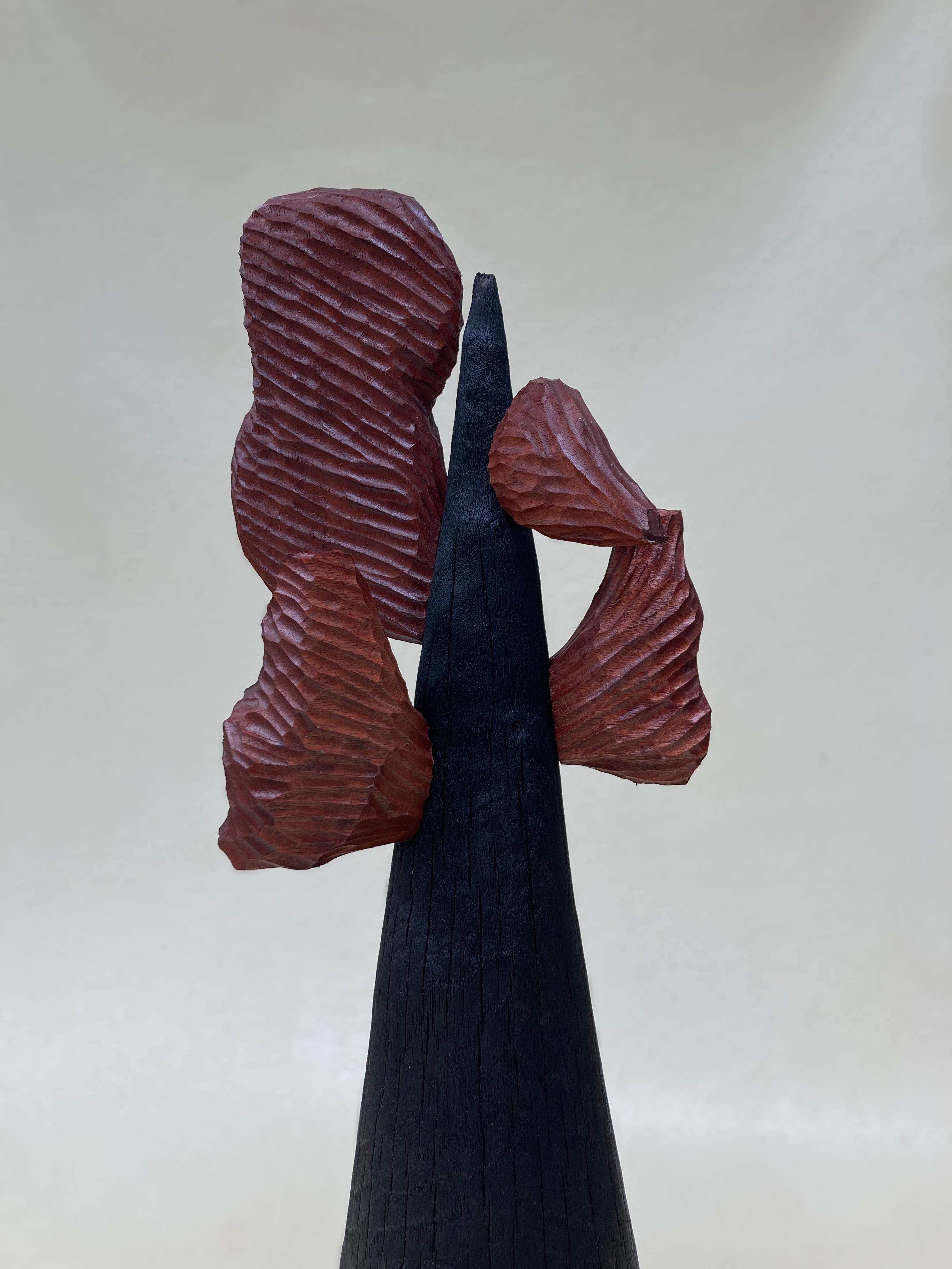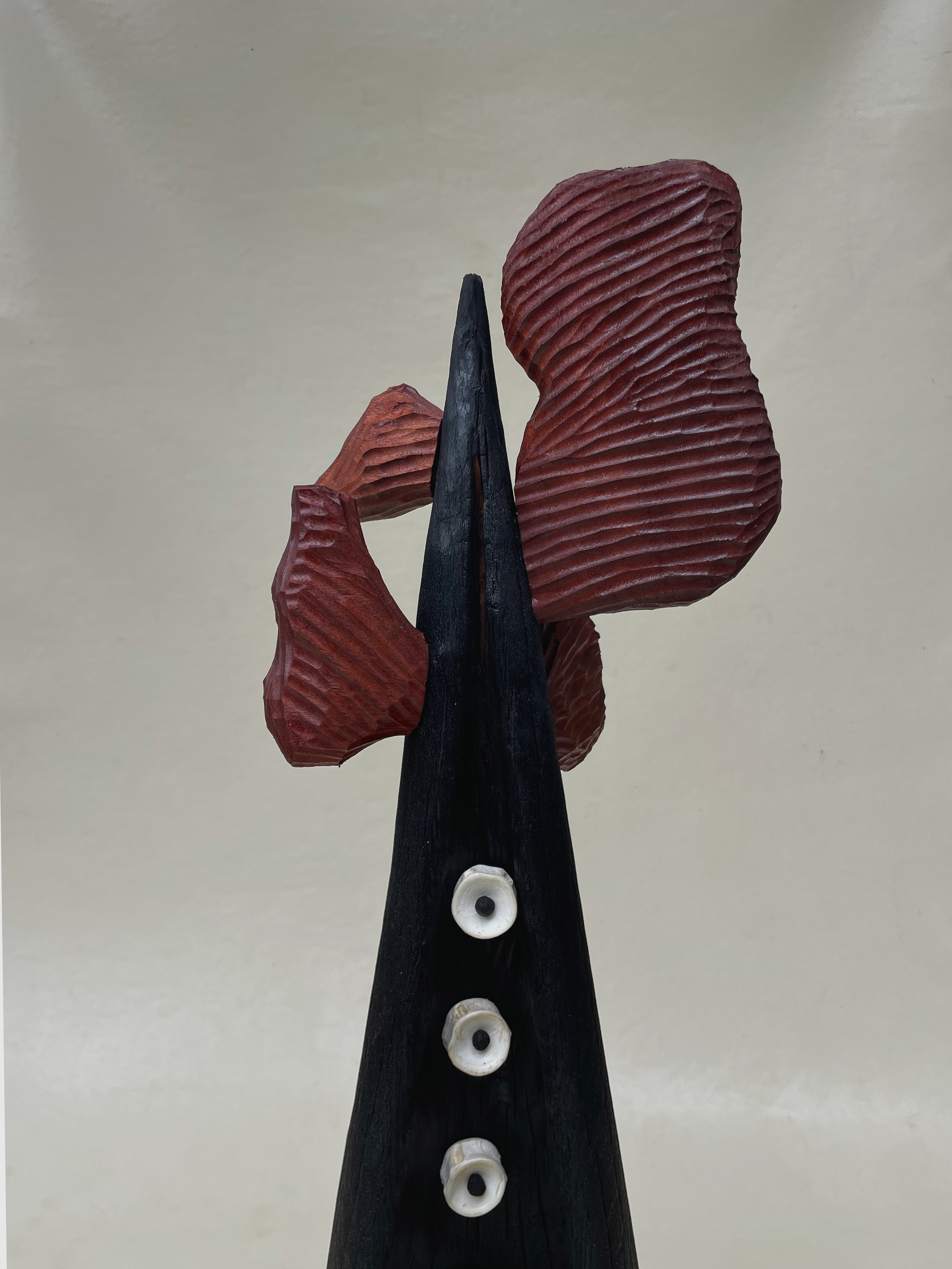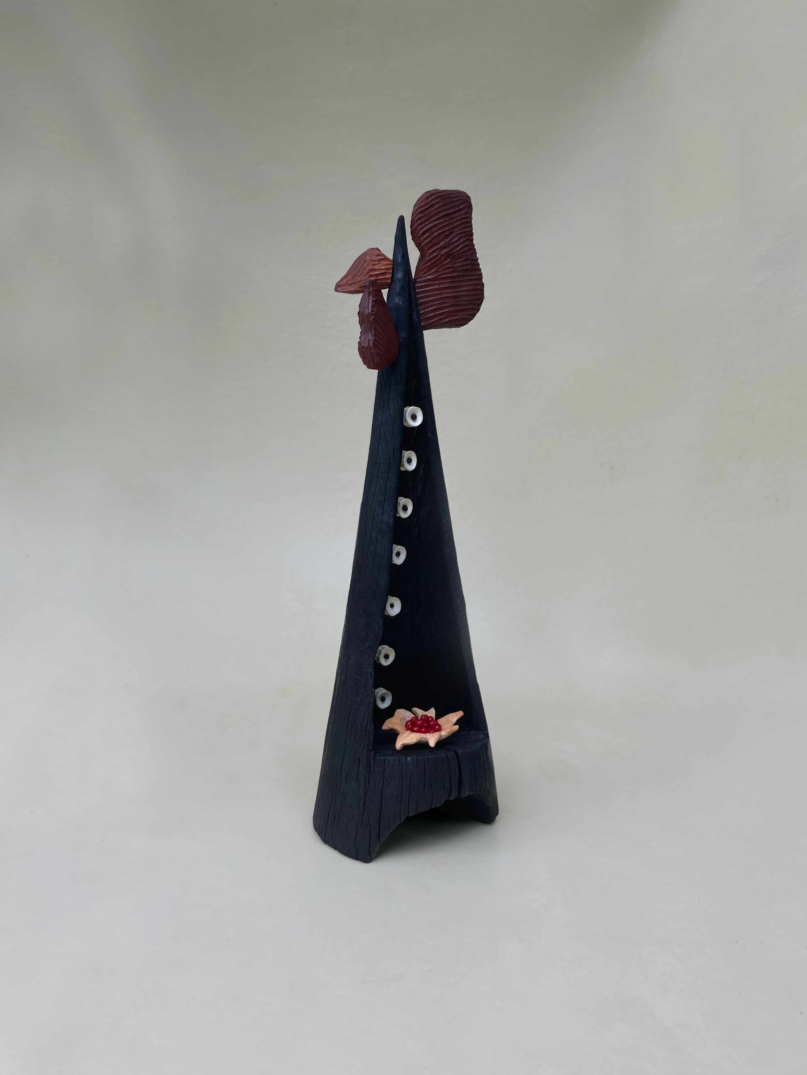 Shark vertebras, charred oak wood, wild clay fired with wood