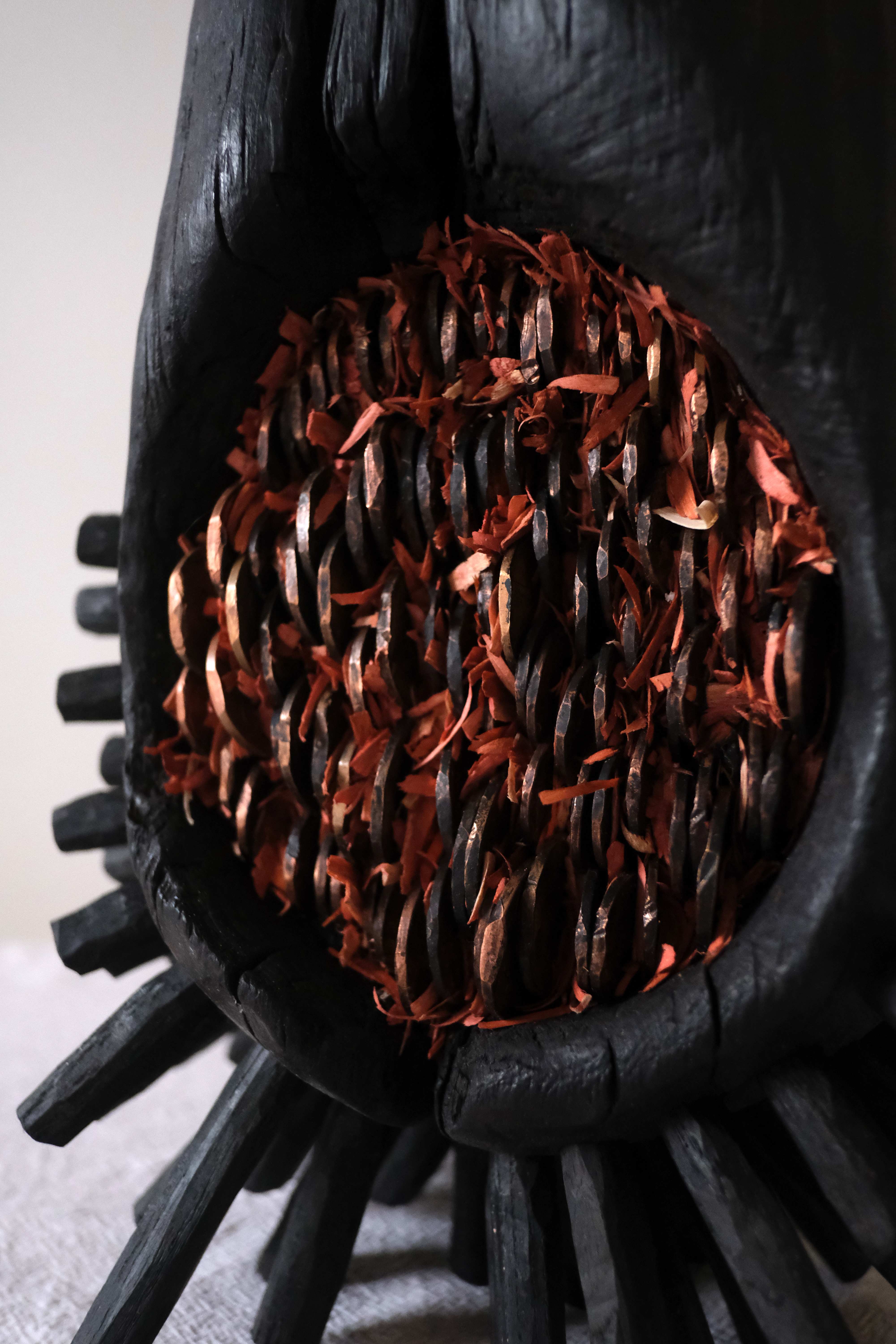 Charred sycamore wood, coins, wood stain, wood shavings