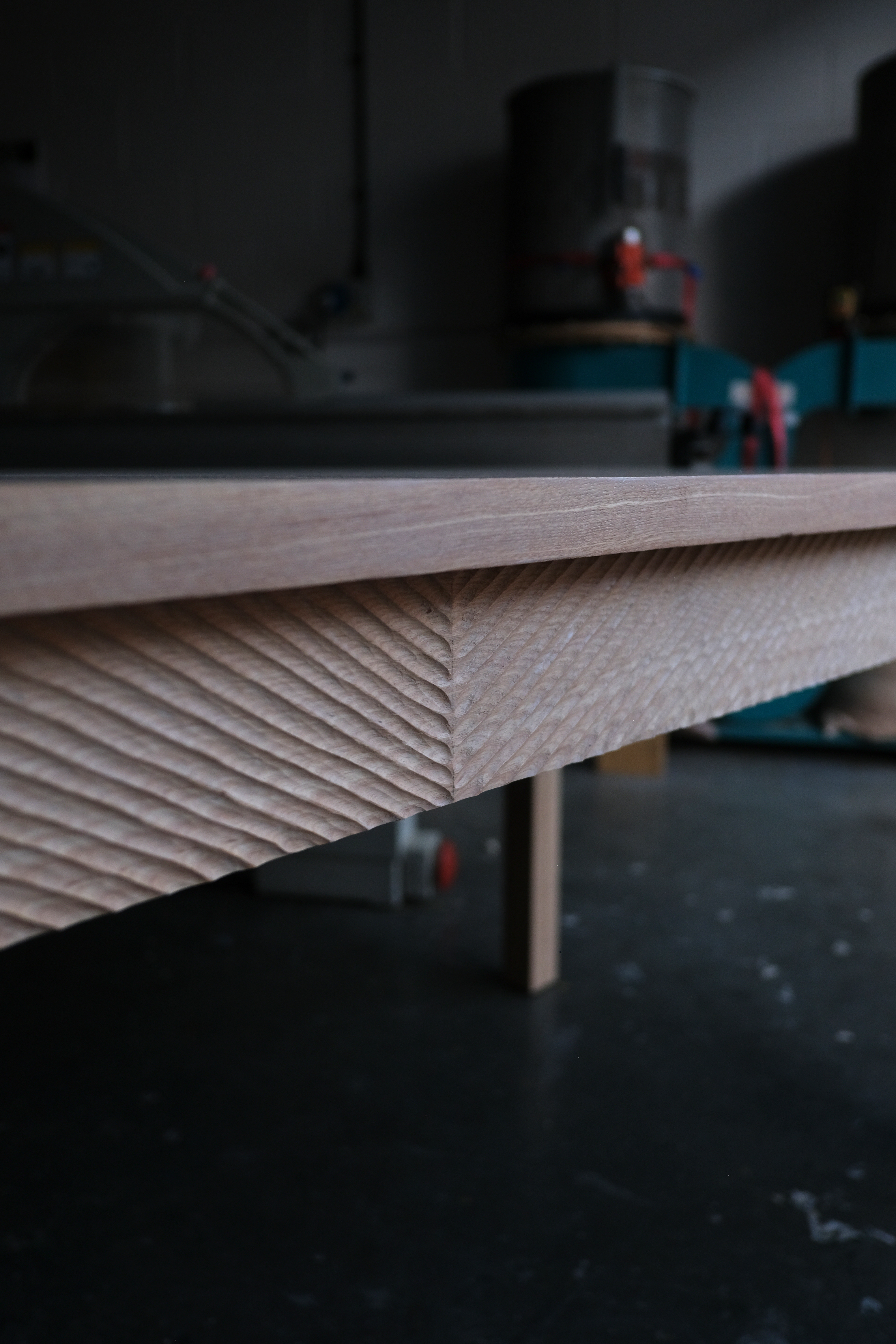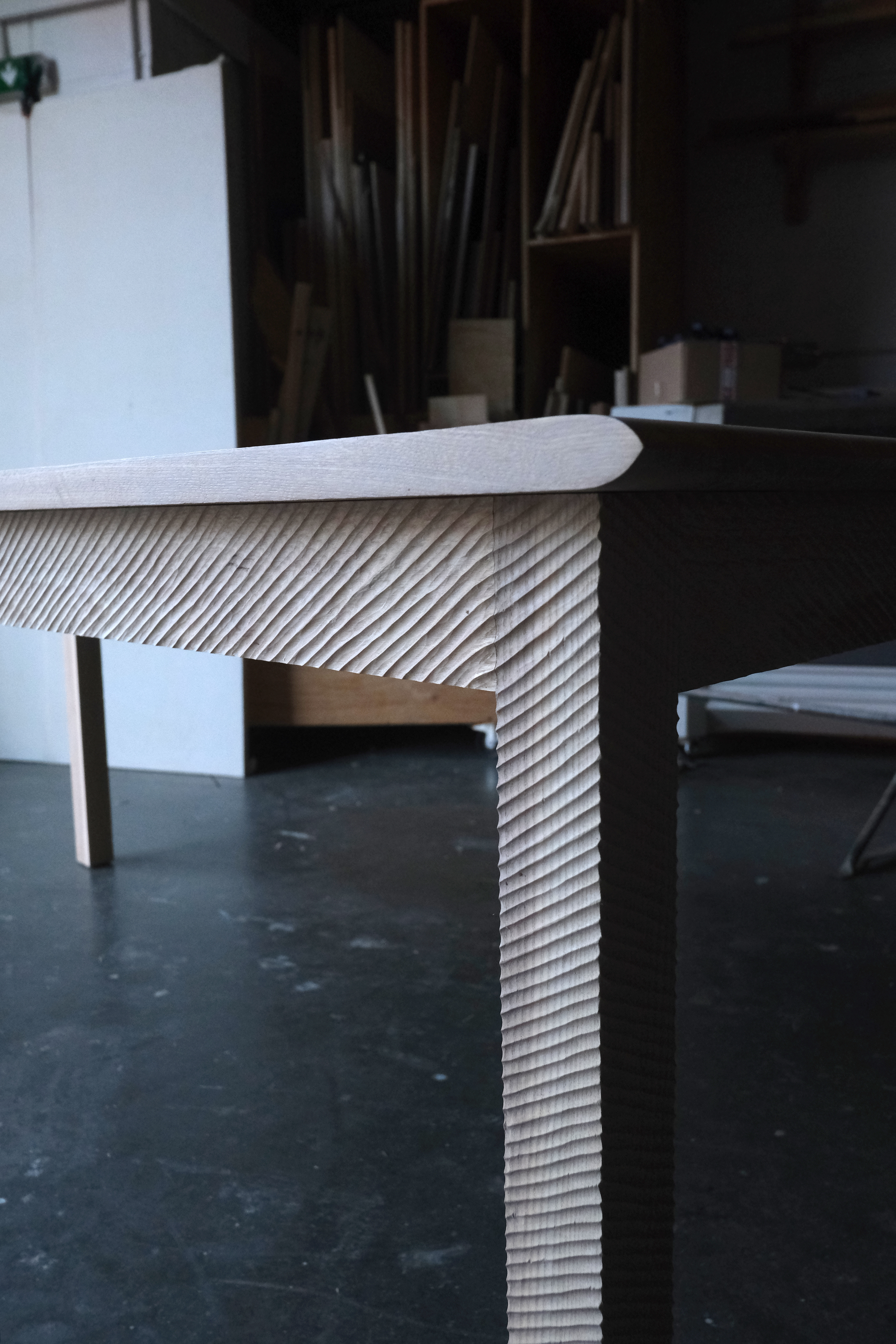 Ammonite is a dinning table made of solid ash timber. The legs and rails are all hand carved, evoking the ripples of an ammonite.