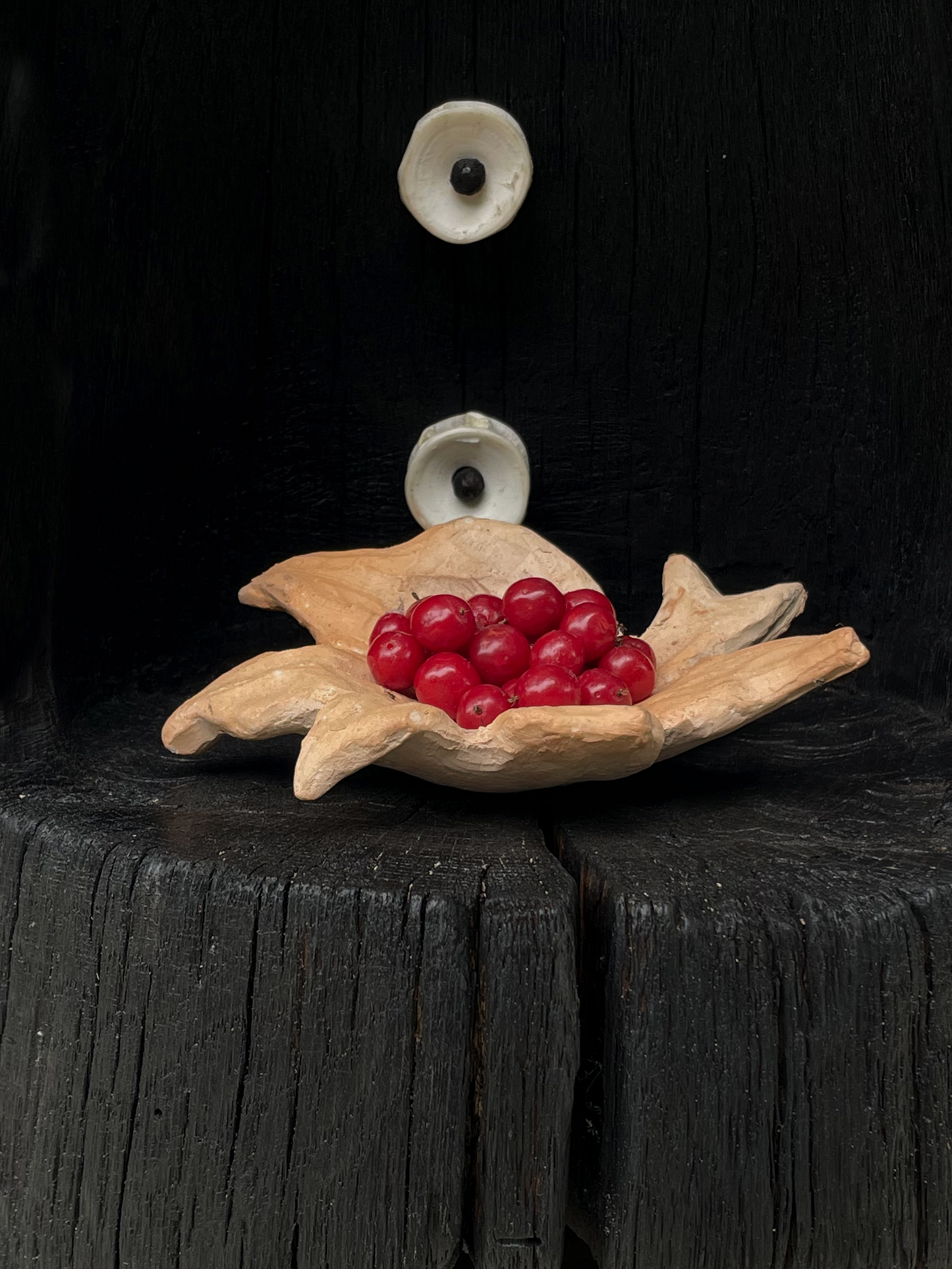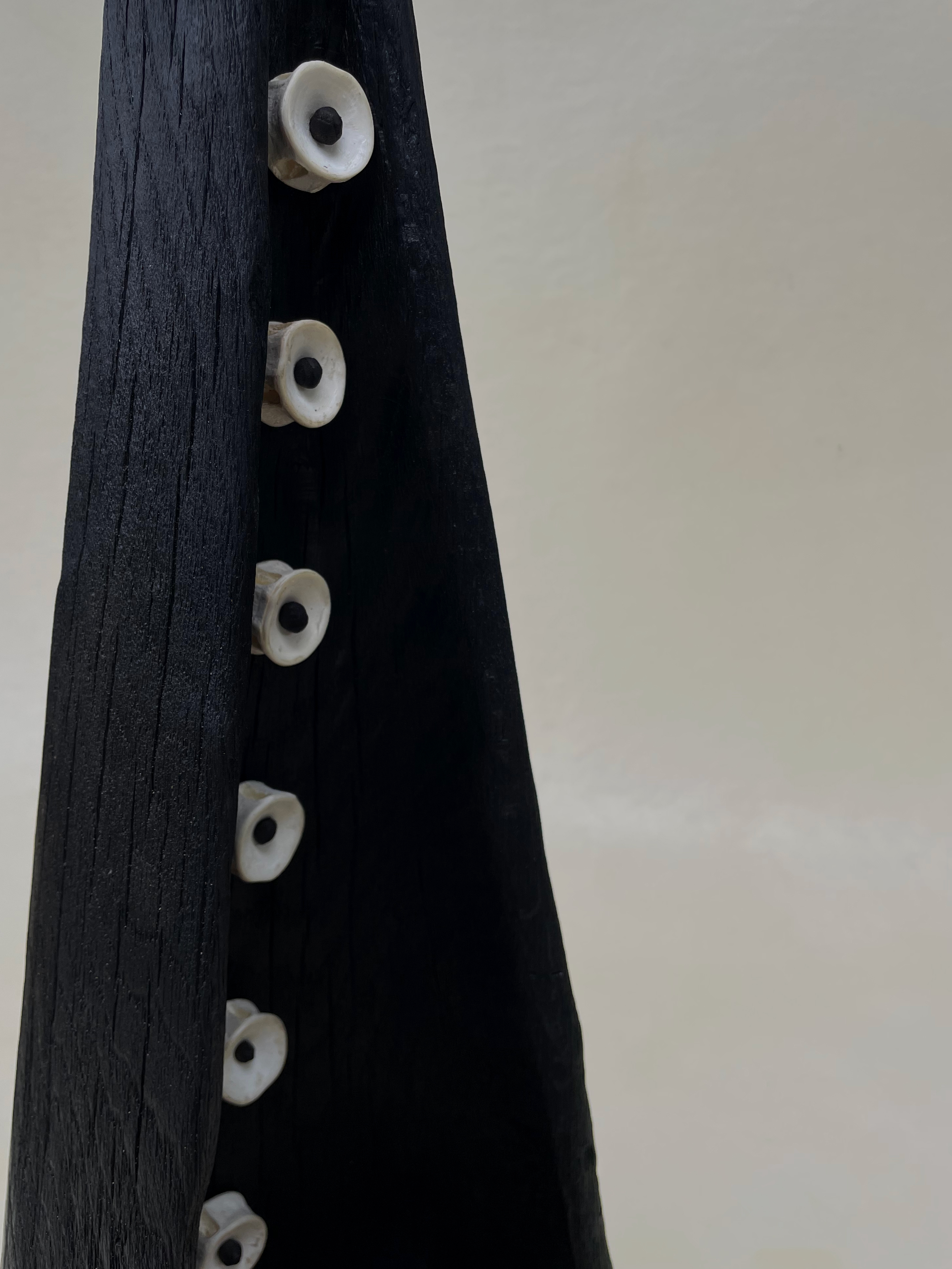 Shark vertebras, charred oak wood, wild clay fired with wood
