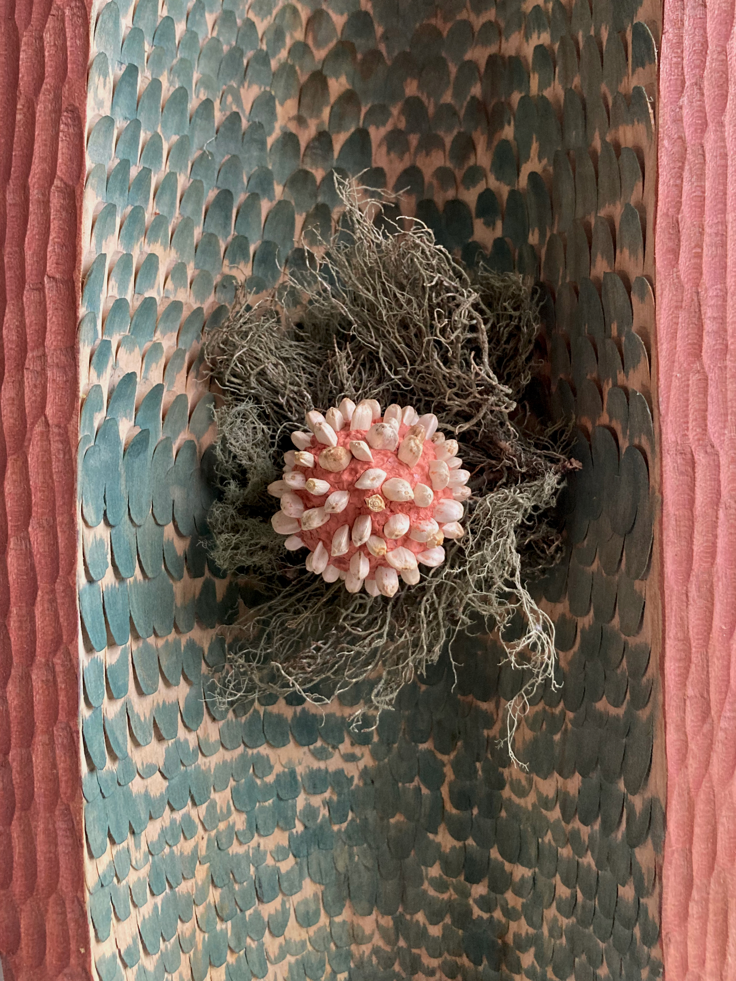 Sycamore wood, lichens, dyes, clay, sunflower seeds, volcanic rock