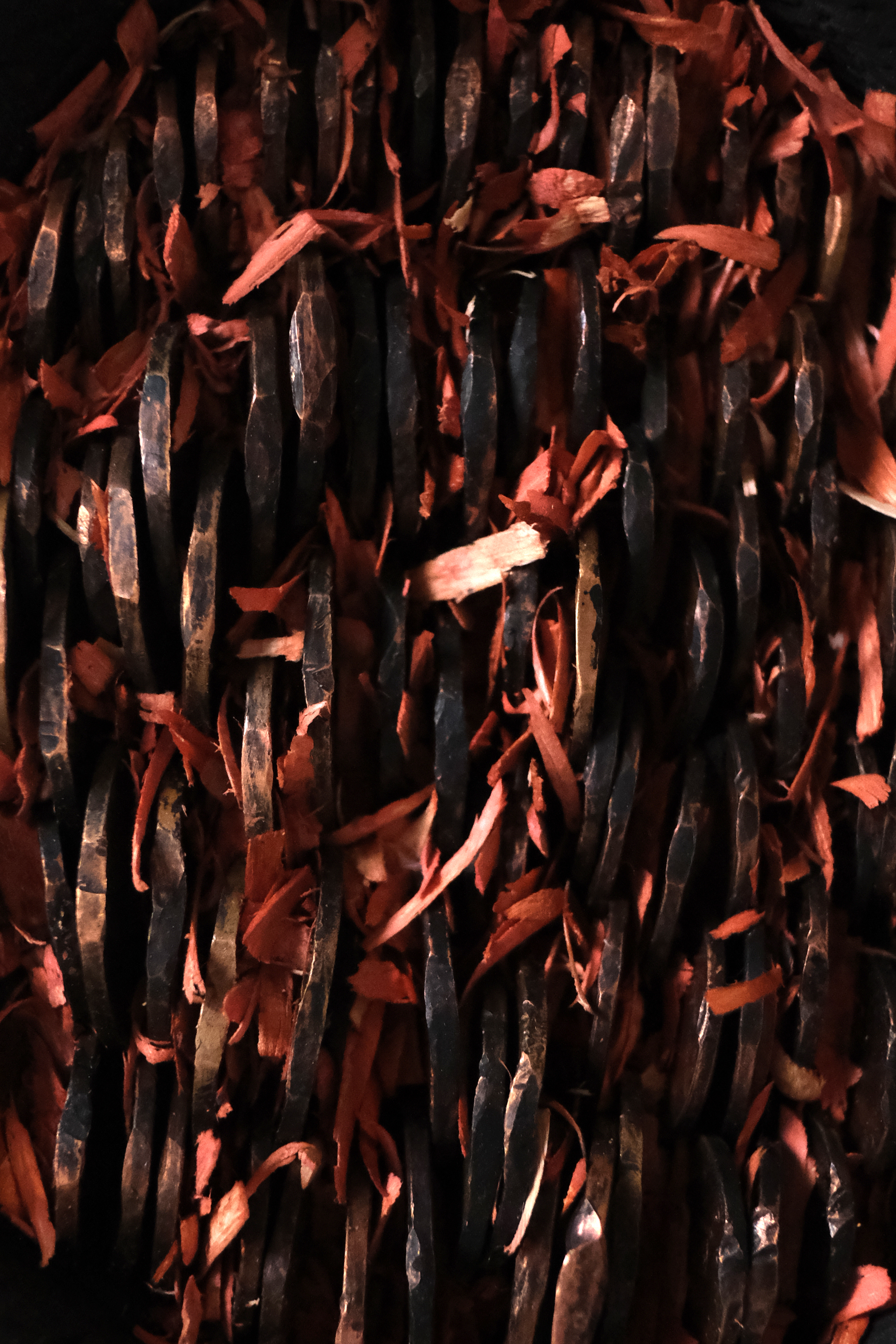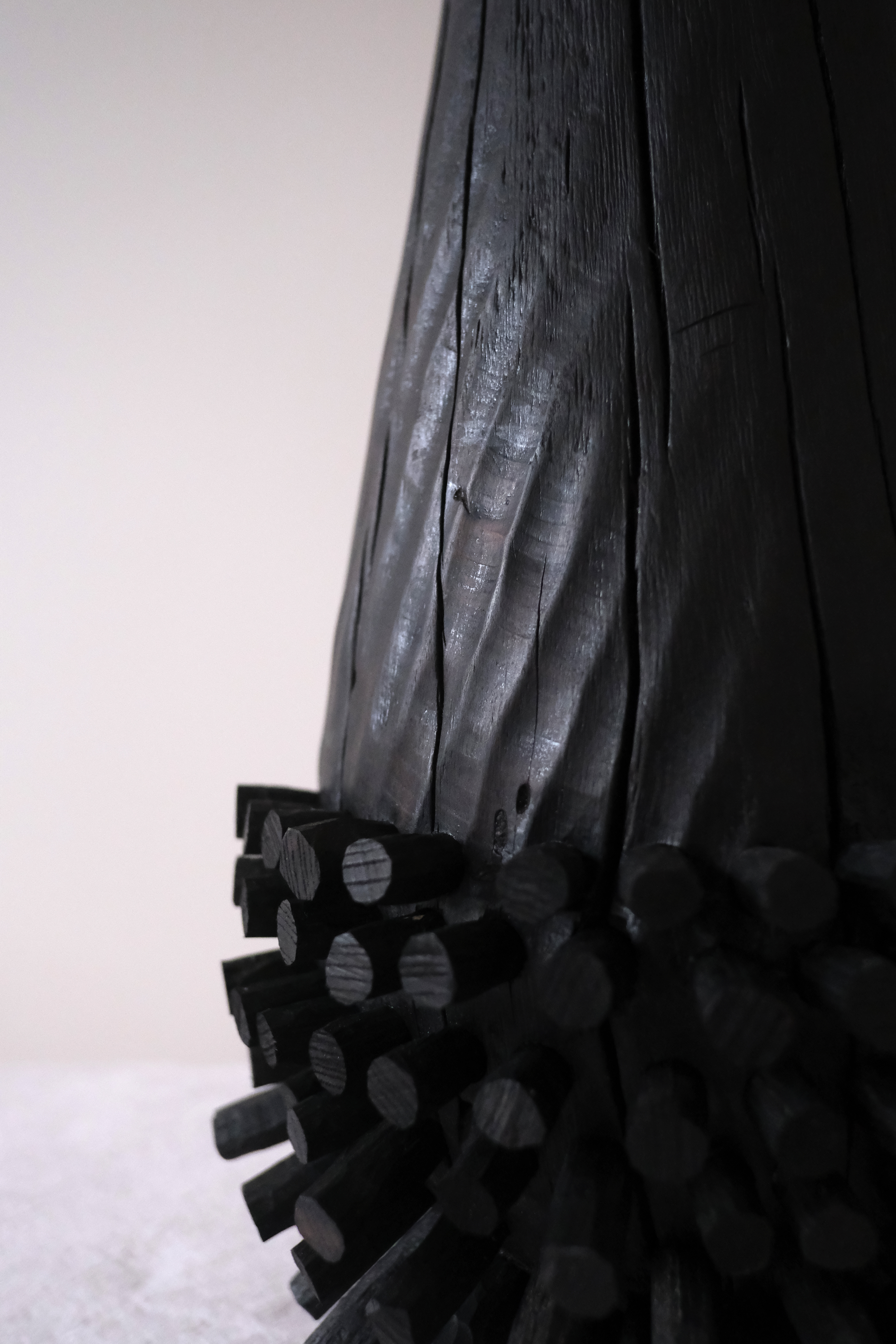 Charred sycamore wood, coins, wood stain, wood shavings
