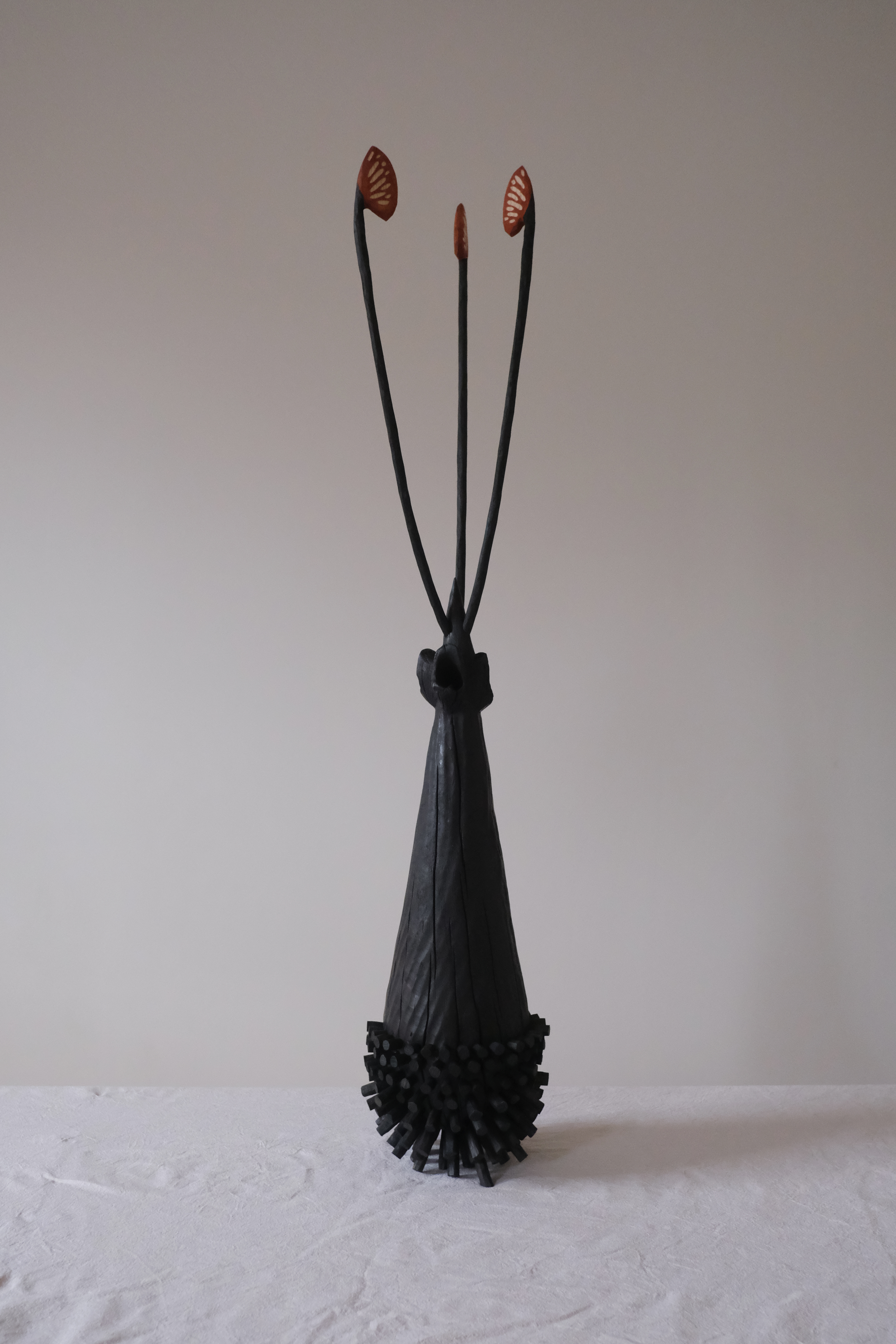 This piece represents the process of ecological regeneration, through which degraded land gradually becomes fertile. The sculpture incorporates coin trees, a folk practice in which coins are hammered into the bark of a tree as a way of connecting with it.